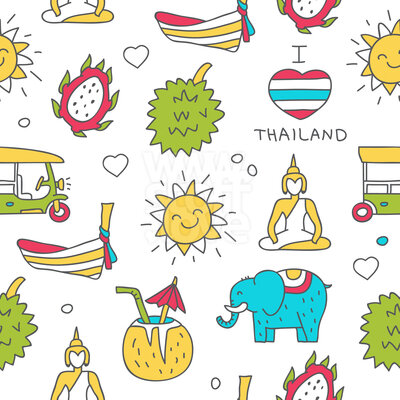 Willkommen In Thailand: Musterdesign mit niedlichen Thai Symbolen.