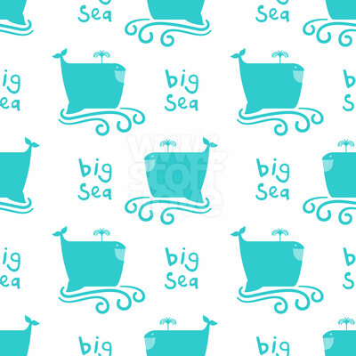 Lustiger Wal: Nahtloses Muster mit lustigen Walen auf wirbelnden Wellen.