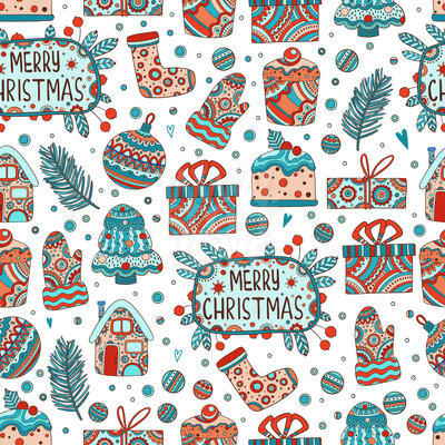 Frohe Weihnachtesfeiertage: Weihnachten kurz und bündig! Ein Muster, das Geschenke, Baumschmuck und mehr weihnachtliche Elemente zeigt.