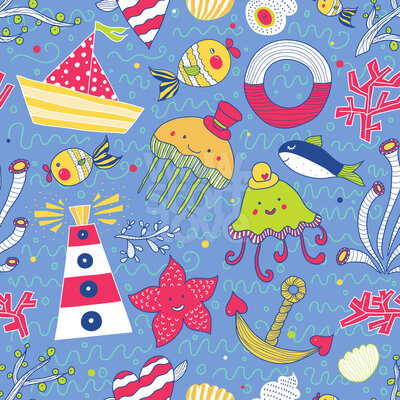Lustiger Ozean: Davon träumen wir alle... Sehr lustiges Kinder-Design mit Fischen, Oktopussen, Quallen, Booten, Leuchttürmen, Seesternen, Ankern, Muscheln, Herzen, Korallen ....